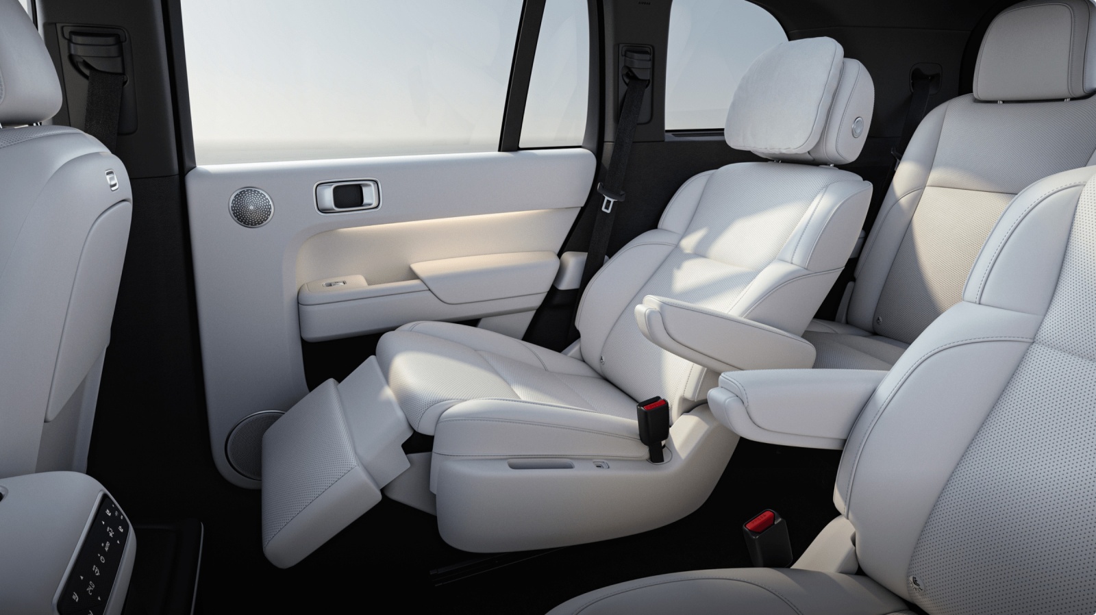 Rândul 2: Mod „Queen Seat” cu suport electric pentru picioare (ottoman) pe partea dreaptă, măsuțe pliabile, ventilație și încălzire.